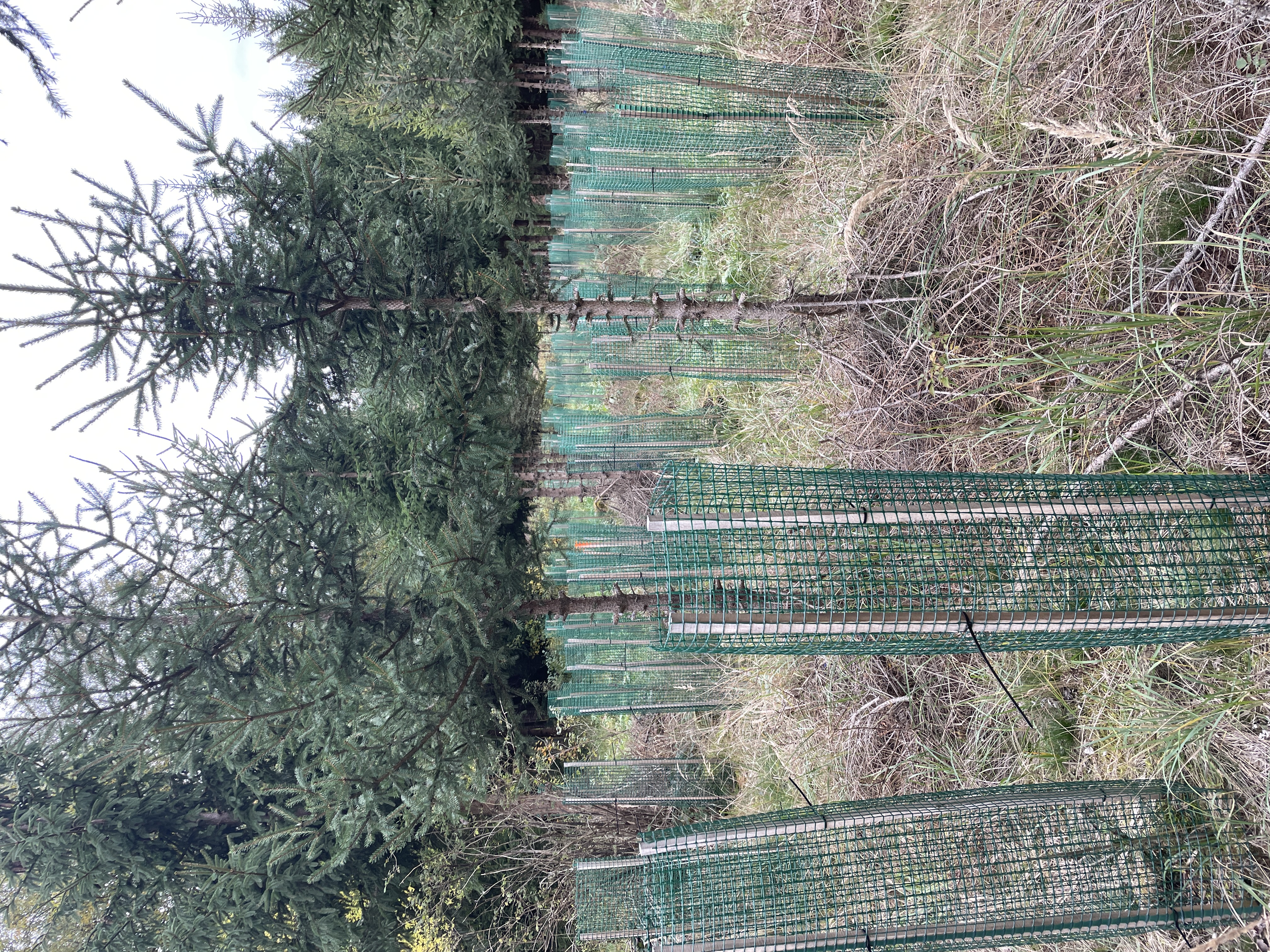 Algunos árboles jóvenes crecen dentro de una zona vallada, mientras que otros están protegidos por guardas individuales. La tasa de supervivencia se sitúa en un sólido intervalo entre el 90 % y el 95 %, lo cual es excelente dadas las exigentes condiciones del lugar. Se encuentra en la llanura de grava de Múnich (Münchner Schotterebene), una de las zonas de Baviera más afectadas por el cambio climático. Al tratarse de un entorno estratégicamente importante pero difícil para el crecimiento de los árboles, elegimos específicamente una mezcla de especies resistentes para este proyecto de restauración forestal.